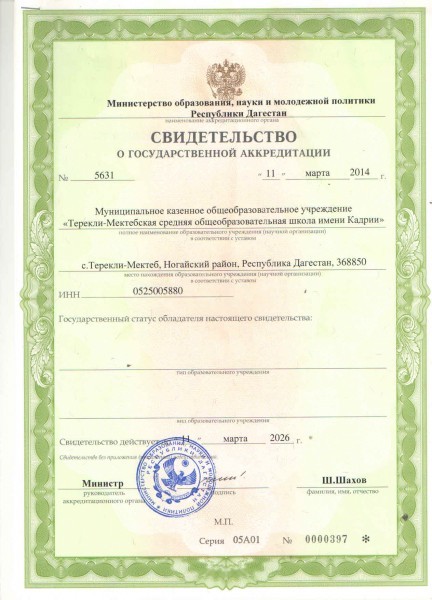 | Полное наименование образовательной организации* | Муниципальное казённое общеобразоавательное учреждение "Терекли-Мектебская средняя общеобразовательная школа имени Кадрии" |